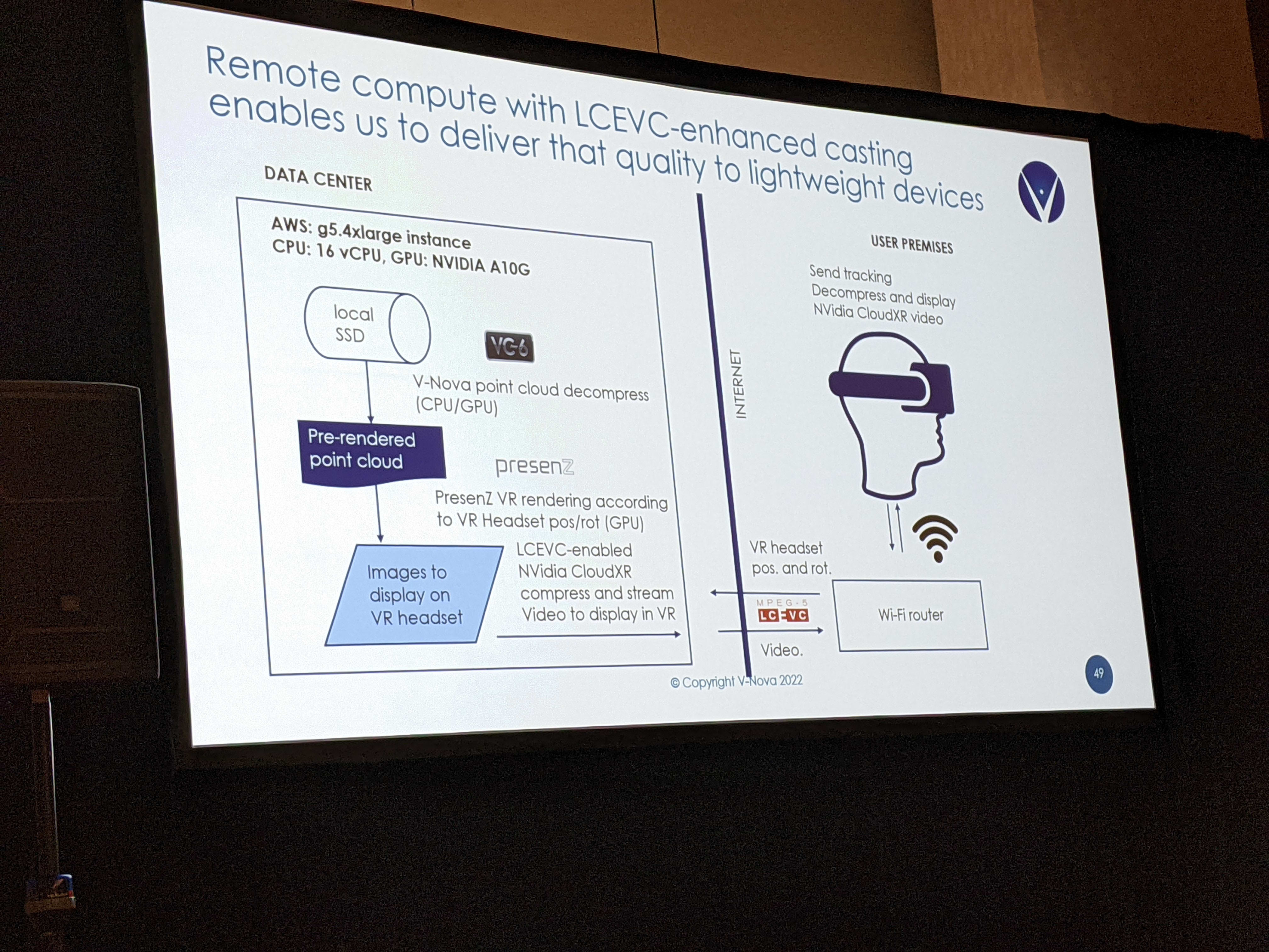 The second part of the session was by V-Nova. They presented on the topic of LCVC enhancement of codecs. They spoke about the ability to convert existing still images and videos into immersive 6 degrees of freedom experience. Since such experiences are going to be common, there is a need for delivering rich experience as well. However, coding-decoding on device is limited by the headset capabilities. So they proposed that the computing should be split between CDN and device. In fact, they coined a term, Graphics Delivery Network (GDNs) for handing these kind of content.